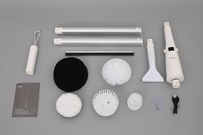 휴빅 욕실청소기 HB-200W는 갈색의 골판지 상자에 담겨 있다. 상자 안에는 구성품으로 본체와 두 개의 연장봉, 여러 개의 브러시류와 스퀴지, 충전용 USB 케이블, 접착식 벽걸이, 그리고 사용 설명서 등이 제공된다.