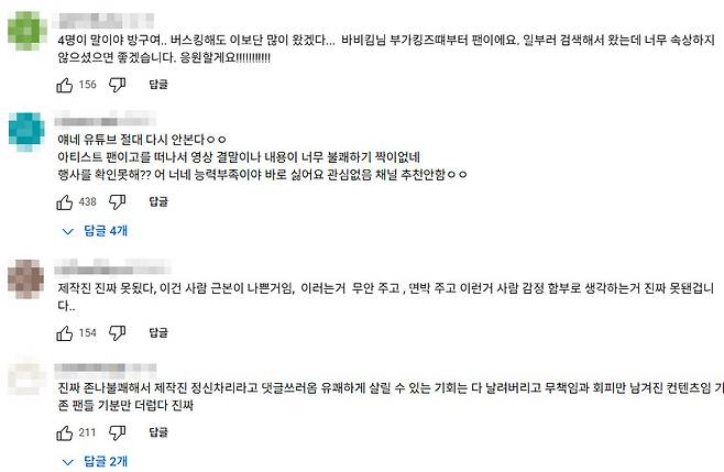 누리꾼들은 이에 분노하며 "이 유튜브를 볼 이유가 없다. 팬이 아니더라도 결말이 불쾌하다", "제작진이 어떻게 섭외한 장소 근처 행사도 모르고 관객을 모으라는 미션을 줄 수 있나", "우리는 바비킴 검색해서 보는데.. 속상하지 않았으면" 등의 반응을 보이며 바비킴을 응원했습니다.