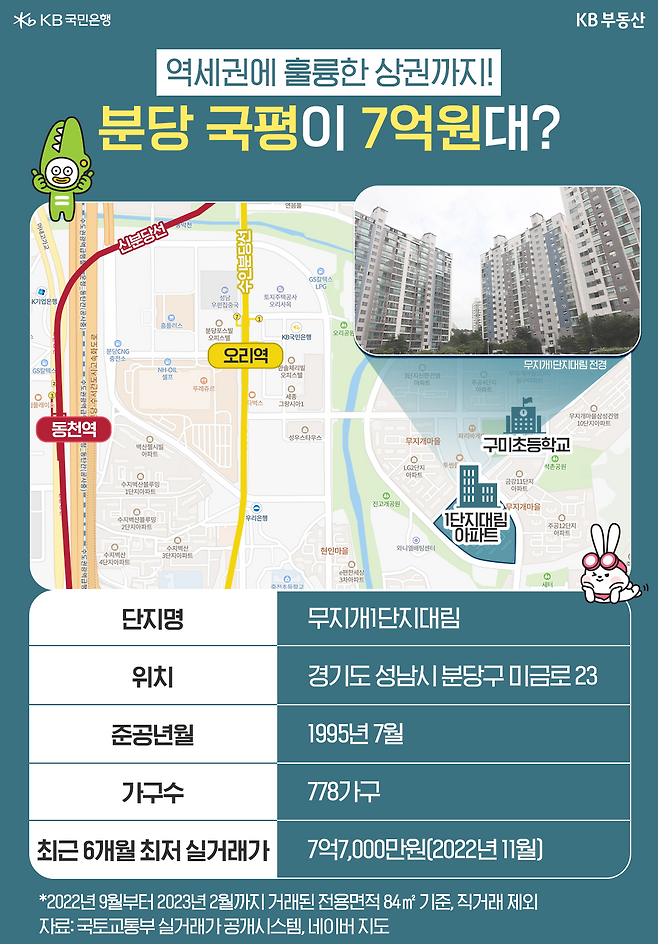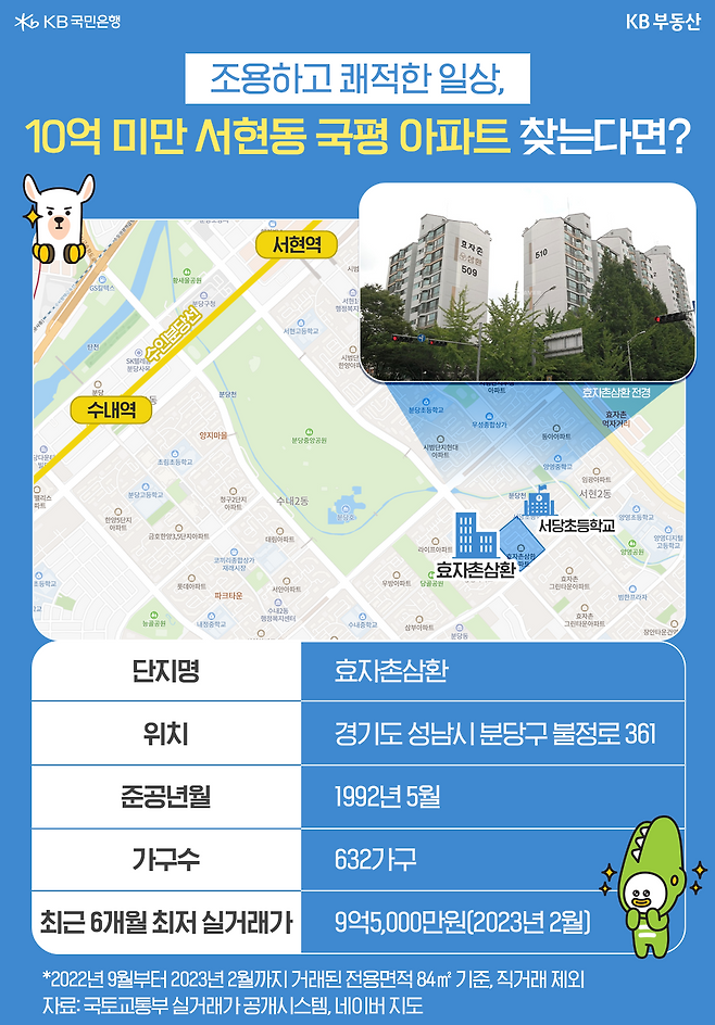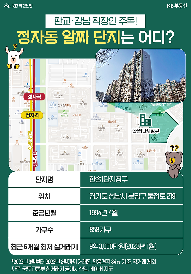 ‘천당 아래 OO’, ‘1기 신도시 맏형’, ‘재벌집 막내아들 진도준이 선택한 곳’. 모두 분당을 가르키는 수식어입니다. 분당은 뛰어난 교통과 더불어 잘 정돈된 도시환경 덕분에 수십 년째 인기 주거지로 평가받고 있습니다. 특히 최근에는 1기 신도시 특별법에 관한 내용이 더해지면서 관심이 증가하고 있죠. 이에 KB부동산이 최근 6개월간 분당에서 거래된 국민평형(전용면적 84㎡, 이하 국평) 아파트 중 저렴한 단지를 조사해봤습니다.