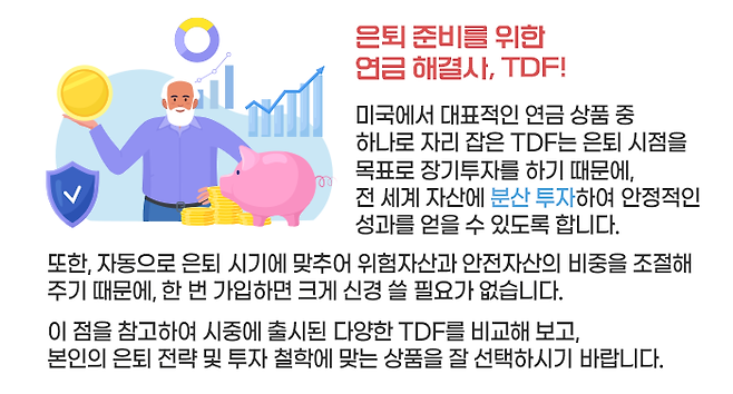 네. 요즘 목표 시점에 맞춰 주식과 채권의 비중을 알아서 조정해 주는 펀드인 TDF(Target Date Fund)에 대한 관심이 많아지고 있습니다.