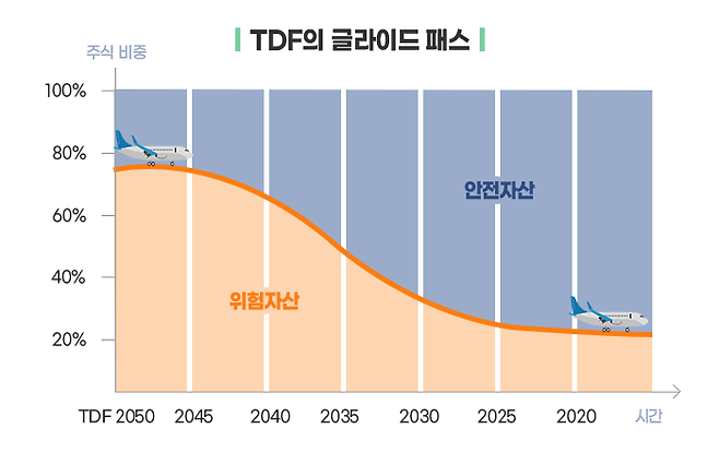 자산 비중 조절은 펀드에서 미리 정한 경로를 따라 투자기간 초기에는 주식(위험자산) 비중을 높게 유지하다가 목표일이 다가올수록 낮춰가는 방식으로 진행됩니다. 이렇게 시간 흐름에 따라 주식 비중을 차츰 낮춰가는 자산배분곡선이 비행기가 착륙하는 경로를 닮았다고 해서 글라이드 패스(Glide Path)라고 합니다.
