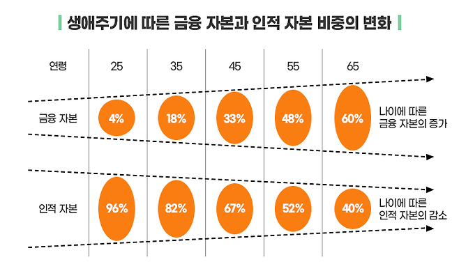 하지만 나이가 들어가면서 인적 자본 가치도 감소하고, 금융 자본의 규모는 차츰 늘어나게 됩니다.