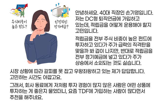 우리말로 번역하면 ‘목표 시점 펀드’라고 할 수 있는데, 영문 머리글자를 따서 TDF라고 부릅니다. 손기영 씨와 같은 고민을 하는 직장인 분들은 TDF를 자세히 살펴보시는 것도 좋을 것 같습니다.