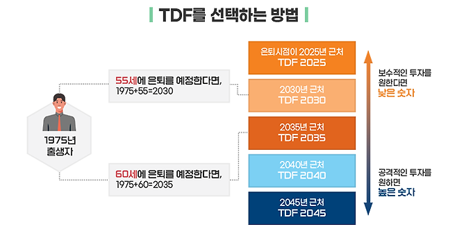 남들보다 높은 수익을 올리기 위해 어느 정도 위험을 감수하겠다는 이도 있고, 반대로 수익이 좀 적더라도 변동성이 적은 투자대안을 선호하는 이도 있습니다. 따라서 TDF를 고를 때 이 같은 투자성향을 반영해 목표 시점을 일부 조정할 수 있습니다.