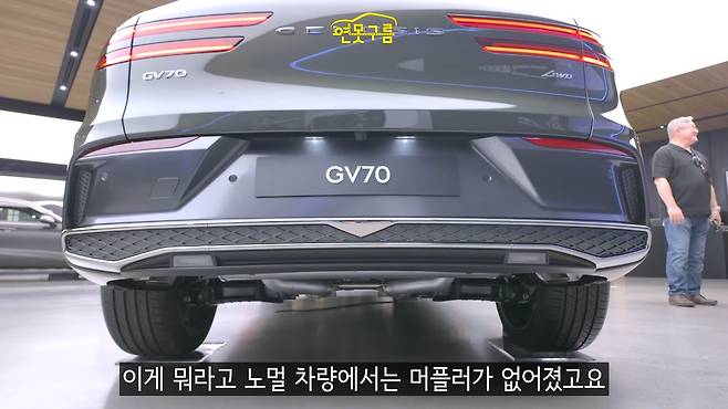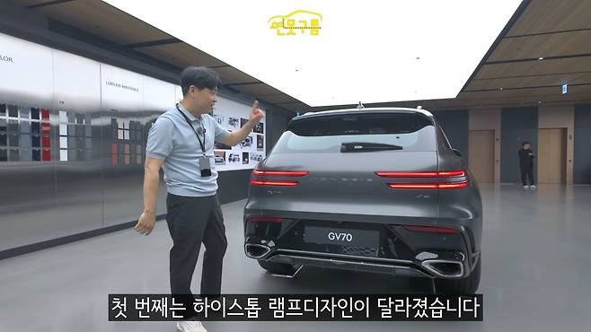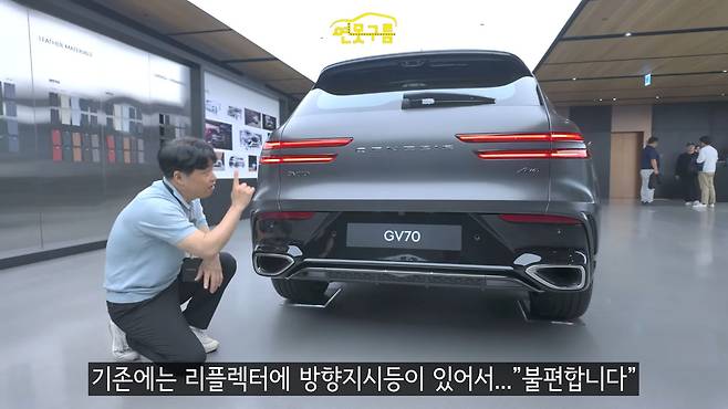 GV70의 후면부 디자인이 기존 모델과 몇 가지 차이점을 보인다. 하이 스톱 램프의 디자인이 달라졌다. 기존에는 램프 영역이 꺾여 있었지만, 신형 모델에서는 면적이 크게 확대되면서 고급스러운 느낌을 준다. 또한 두 개의 카메라가 새롭게 탑재되었음을 알 수 있다.