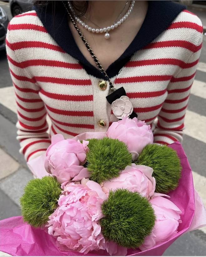 여기에 화사한 핑크 꽃다발까지 더해 마치 영화 속 주인공 같은 스트릿 프렌치룩을 보여줬습니다.