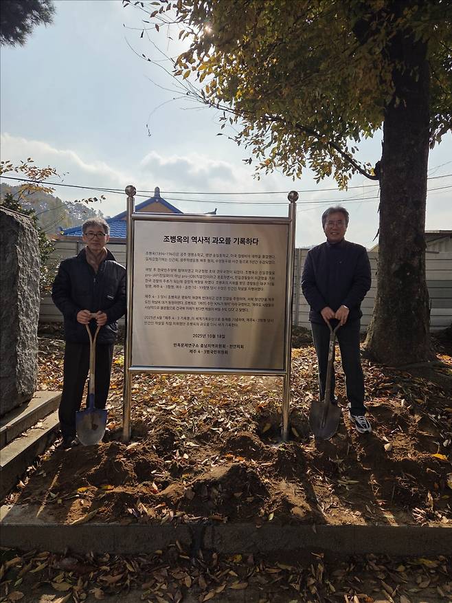 민족문제연구소 충남지역위원회(위원장 최기섭)와 천안지회, 그리고 (사)제주4·3범국민위원회(이사장 백경진)는 11월 9일(일) 천안시 동남구 병천읍에 조성된 조병옥 생가 앞에 해방과 정부수립과정에서 경무부장 조병옥이 행한 학살의 진실을 밝히는 안내판을 설치했다.