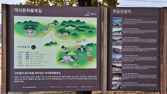 | ▲ 조병옥 생가 앞에 세워진 천안시 주요 관광지 안내판 천안시가 제작하여 설치한 역사문화둘레길과 주요 관광지를 소개하는 안내판에 조병옥 생가가 포함되어 있다 |