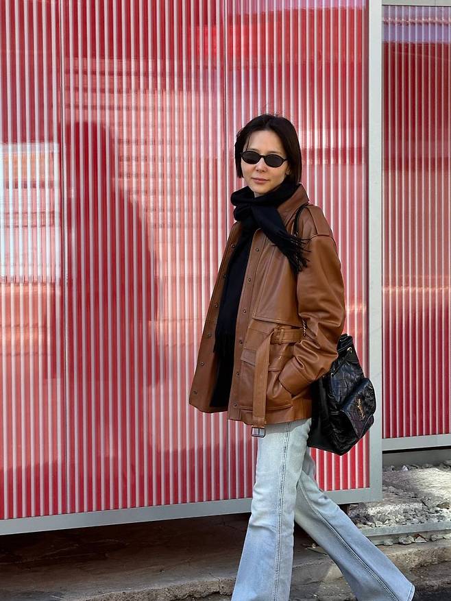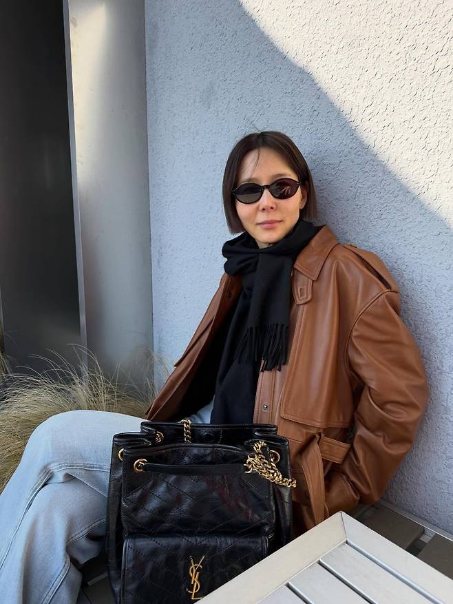 여기에 어깨에 멘 큼직한 검은색 가죽 가방은 전체적인 차림에 도회적인 멋을 더해주며, 그녀만의 감각적인 패션 스타일을 완벽하게 마무리하는 영리한 포인트가 됩니다.