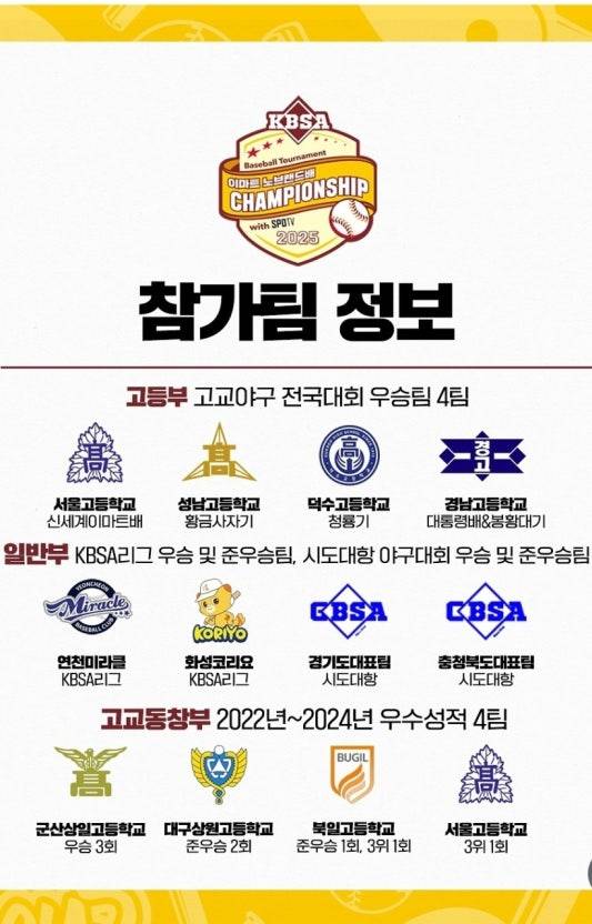 고등부, 일반부, 고교동창부로 세분해 치러진다. 고등부는 올해 대한야구소프트볼협회(KBSA)가 주관, 스포티비가 고교야구 시리즈로 노출했던 전국 대회인 신세계 이마트배, 황금사자기, 청룡기, 봉황대기, 대통령배 우승팀들이 출전한다.