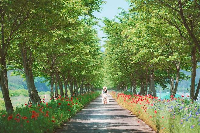 강변을 따라 흐드러지게 핀 양귀비꽃이 하늘빛과 어우러져 마음까지 환하게 물드는 화정양귀비꽃길.