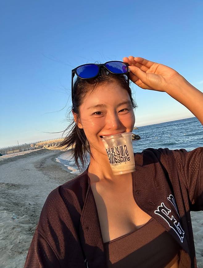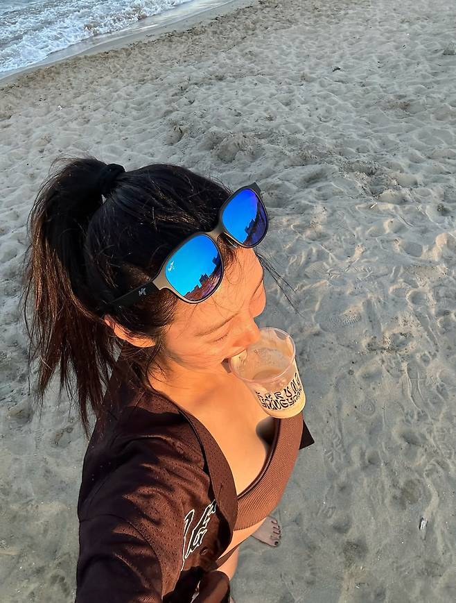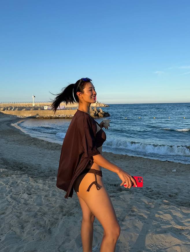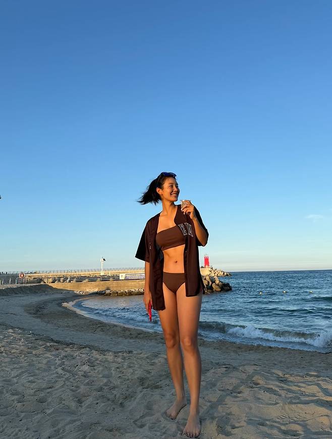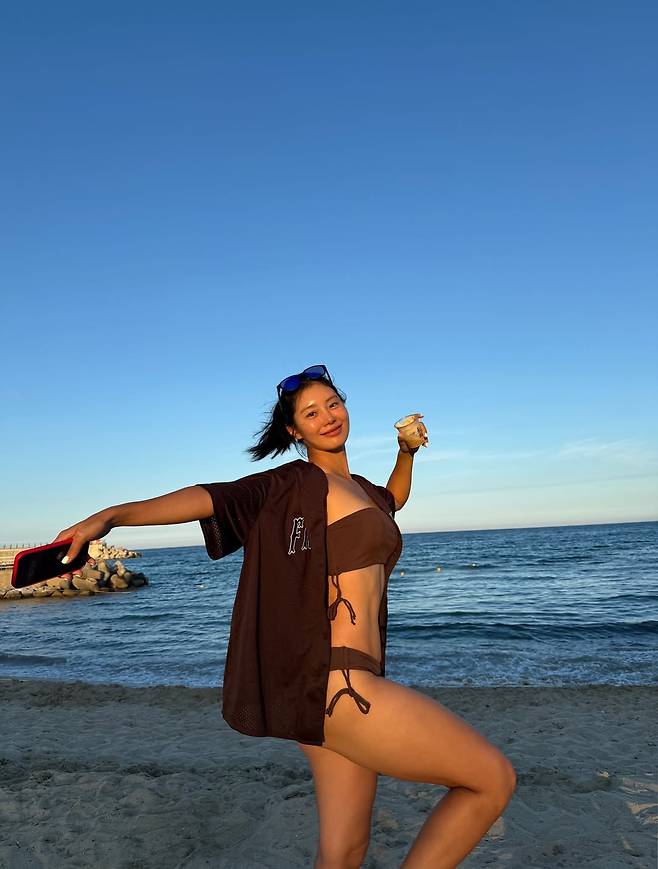 해변을 산책하며 커피 한 잔을 즐기는 모습, 해맑게 웃으며 바닷바람을 만끽하는 순간마다 드러나는 건, 단순한 ‘몸매’ 이상의 건강함과 긍정의 기운이다.
