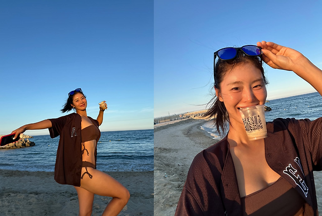 브라운 컬러의 비키니와 여유롭게 걸친 반소매 저지, 그리고 거울처럼 반짝이는 선글라스까지 강소연의 여름날은 그 자체로 활력이 가득하다.