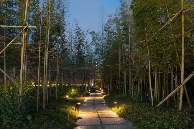 부대시설인 테라로사 카페에는 옛 공장의 철판으로 제작된 테이블이 놓여 있고, 외부의 대나무 숲길 바닥도 기존 콘크리트 자재를 재활용해 공장의 정체성을 세련되게 살렸는데요.