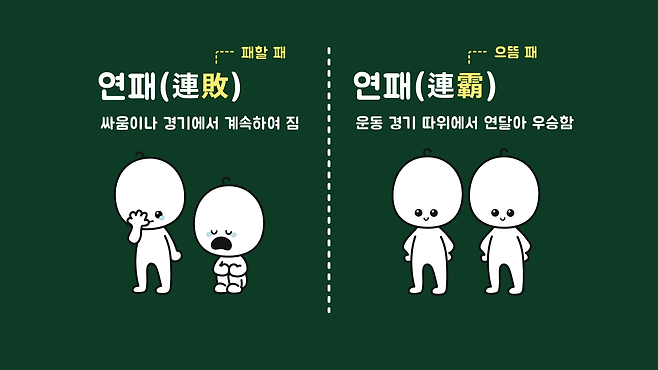 하지만 발음은 똑같아서 듣는 사람 입장에서는 직관적으로 이해하기 어렵습니다. 어쨌든 일상에서는 연달아진다는 뜻의 '연패(連敗)'를 많이 사용합니다.