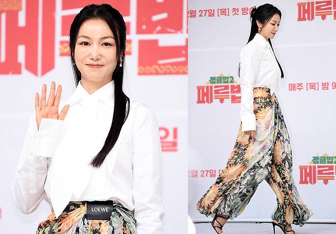 김옥빈은 화이트 셔츠에 과감한 플로럴 프린트 와이드 팬츠를 매치해 우아하면서도 로맨틱한 무드를 완성했습니다.
