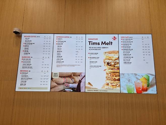주문은 3대의 키오스크로만 받는다. 가격대는 한국에서만 가격을 올렸다고 하지만 스타벅스보다 살짝 저렴한 편이다. 또 키오스크 및 제품 안내 LED에서도 시그니처 메뉴는 단풍 그림으로 아이콘 표시를 달아두어 쉽게 주문할 수 있도록 했다.