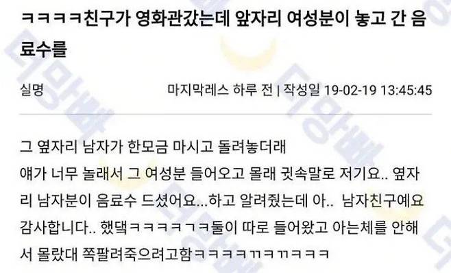 영화관에서 옆자리 여자 음료수 훔쳐 먹는 남자