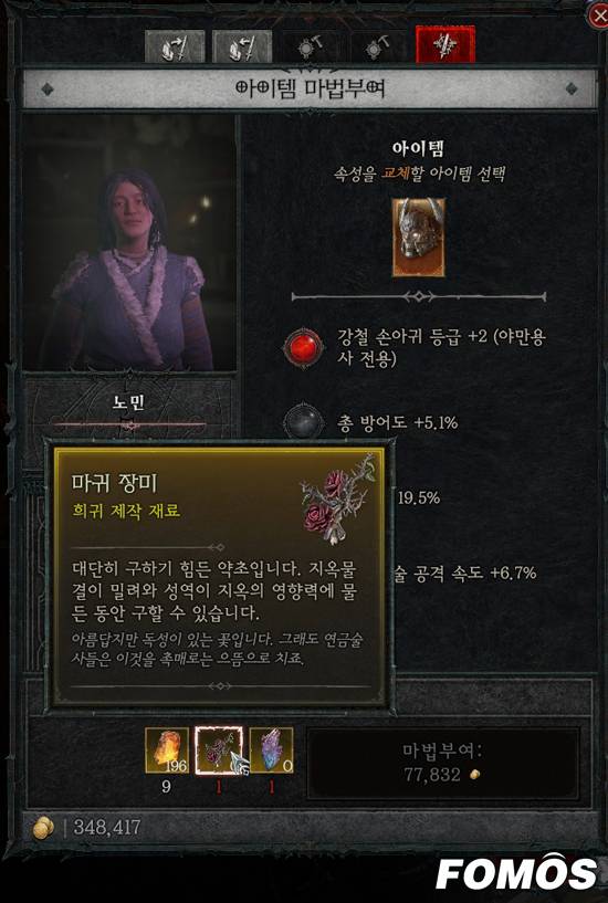 다만 옵션 변경을 위해서는 특별한 제작 재료인 '마귀 장미'와 '잊힌 영혼'이 필요하다.