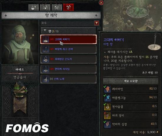 다만 제작에는 많은 수의 재료 아이템이 필요하며 한 번에 하나의 '향'만 사용할 수 있기에 파티원이 돌아가면서 사용하는 것을 추천한다.