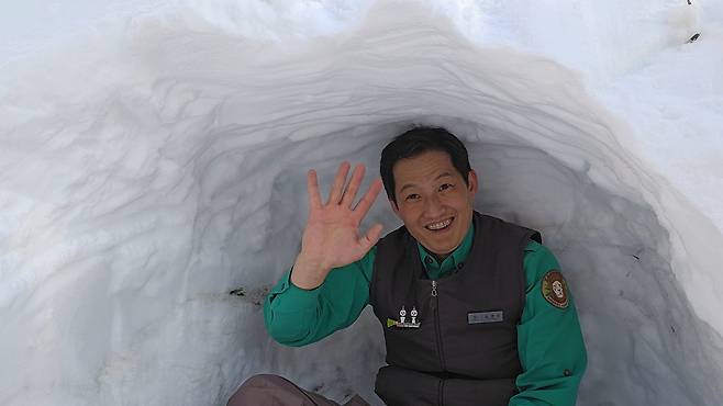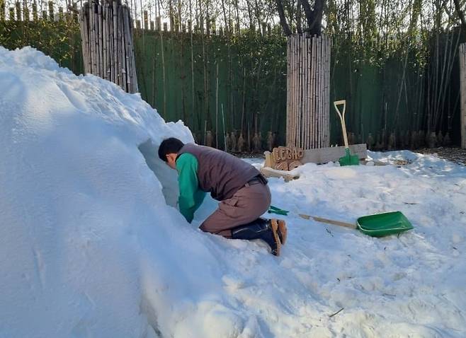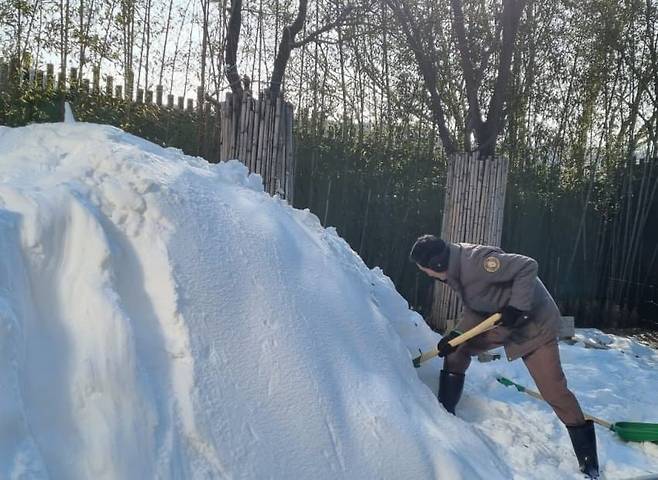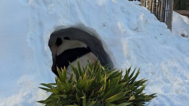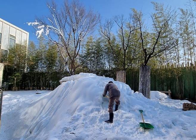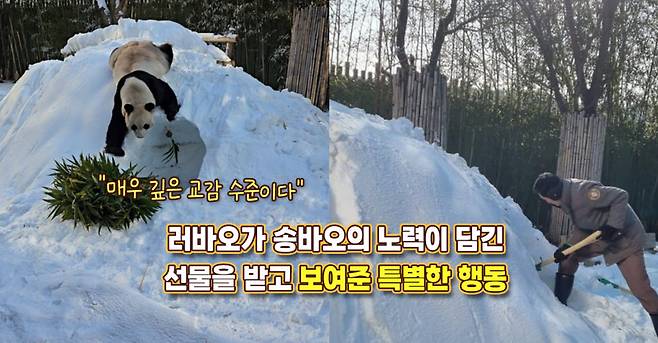 송바오는 방사장에 쌓인 눈을 한 삽 한 삽 정성스레 파내고, 치밀하게 공간을 설계해 러바오를 위한 완벽한 보금자리를 만들어냈죠.