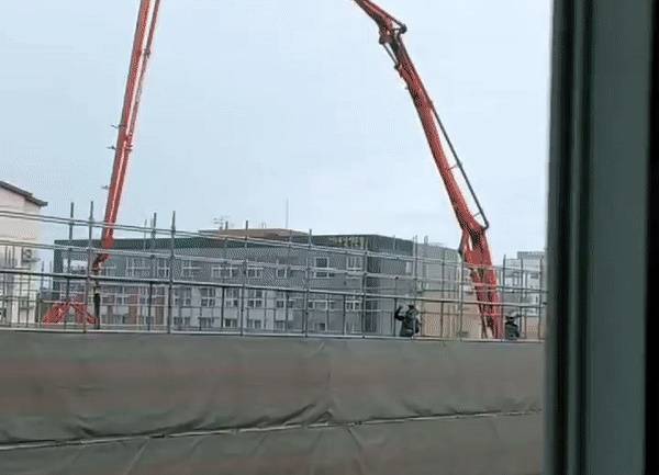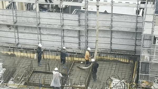 1층 지상에서는 레미콘 차량과 연결된 펌프카의 길쭉한 관이 5층 높이까지 이어져 콘크리트를 쏘아 올리고 있었다.