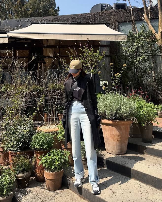 여기에 하이웨이스트 연청 팬츠로 다리를 길어 보이게 연출하고, 베이지 컬러 볼캡과 스니커즈로 편안하면서도 세련된 분위기를 더했습니다.
