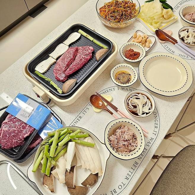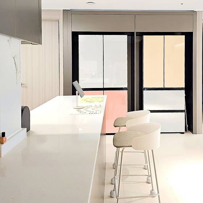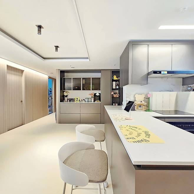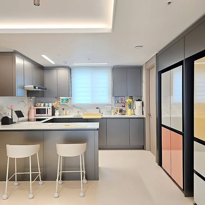 사진으로도 보이지만 거실은 입주했을 때부터 자재들이 모두 그레이 톤이라서 약간은 칙칙하게 보이기도 했어요. 거실과 이어진 공간인데, 두 공간이 너무 상반되어 보일까 봐 전자 제품과 주방 용품은 모두 포인트를 줄 수 있는 색으로 고르려고 했습니다.