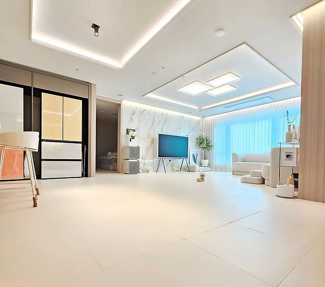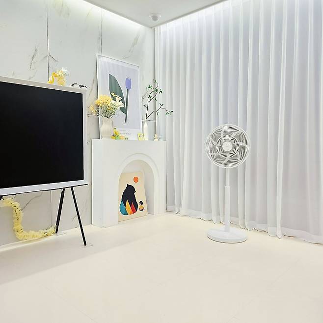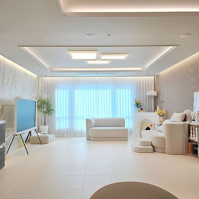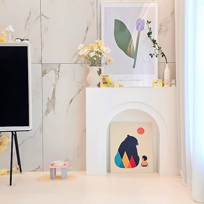 쉬는 시간엔 반려견과 놀거나 TV를 보면서 시간을 지내요. 거실 생활의 중요한 부분을 차지하는 TV는 이젤형 다리가 미니멀한 제품으로 골라보았어요. 덕분에 하얀 인테리어에 가볍고 세련되게 녹아드는 것 같아요.