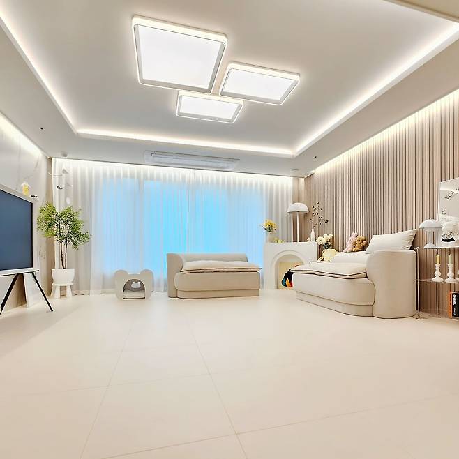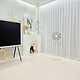 그럼 거실부터 소개해 드릴게요. 이 공간은 벽면의 우드 템바 보드와 어우러지도록 베이지 톤과 화이트 톤을 섞어 인테리어했어요. 반려견을 위해 바닥 매트를 깔아주었는데, 이게 집의 분위기를 바꾸는데 큰 역할을 하는 것 같습니다.