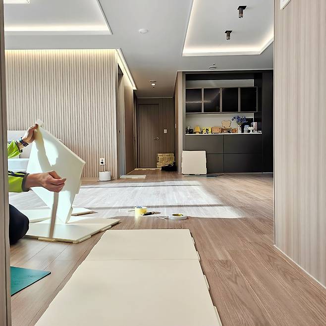 원래 이 집은 평범한 K-아파트의 모습 그대로였어요. 바닥도 일반적인 마룻바닥이었는데, 화사한 공간으로 바꾸고 싶어 바닥 시공 매트를 셀프로 깔아주었습니다. 덕분에 집이 눈에 띄게 화사해졌어요.