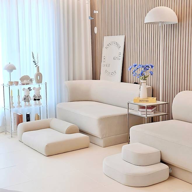 반려 가정은 패브릭이나 침구를 선택할 때 항상 모달 소재나 털이나 먼지가 안 붙는 소재를 선택하게 되는 것 같아요. 또 소파 하나를 선택할 때도 강아지 발톱에 긁히지 않도록 스크래치에 강하면서 인테리어에 어울리는 색감으로 선택했어요. 또 모듈 소파로 분리가 가능한 제품을 선택해서 여러 모습으로 연출하면서 공간이 넓어 보이도록 배치하고 있어요. 가장 좋은 건 화사한 톤이라 시각적으로도 공간이 트여 보이는 점 같아요.