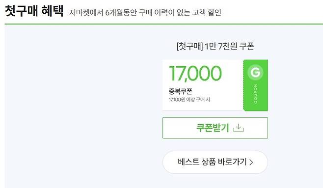 첫가입하고 다운 받으시거나, 6개월 구매 이력 없는 사람 17,100원 구매시 17000원 할인 쿠폰