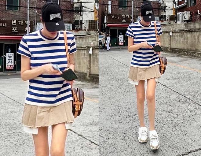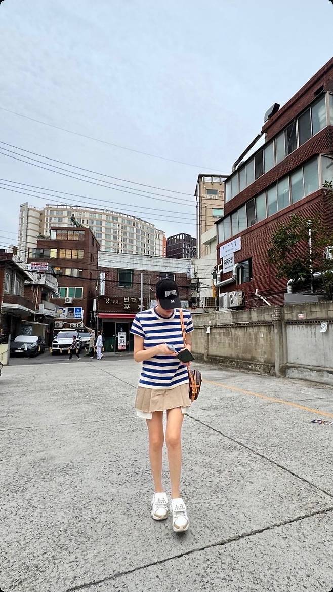 네이비 스트라이프 티셔츠에 베이지 컬러의 테니스 미니 스커트를 매치해 ‘하이틴 무드’를 완벽히 구현했습니다.