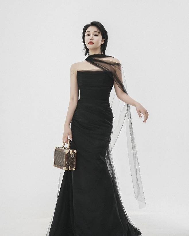 시스루 튤 장식이 더해진 오프숄더 블랙 드레스는 고혹적인 ‘시네마 퀸'을 연상케 했고, 루이비통 트렁크 백으로 하이엔드 감성을 더해 무드를 극대화했습니다.