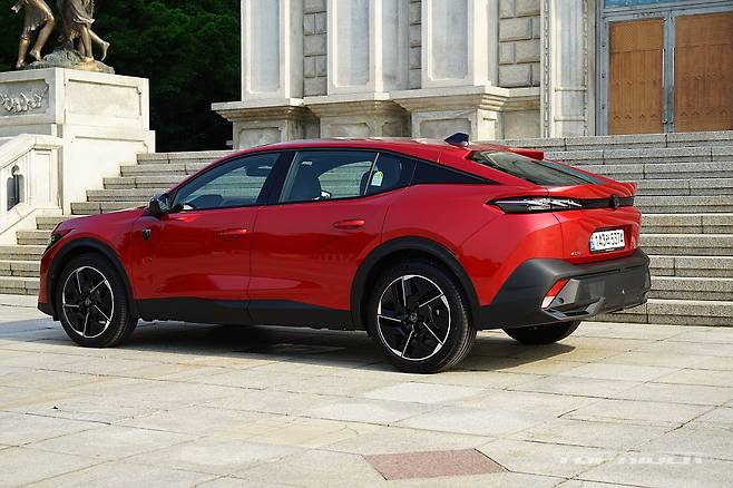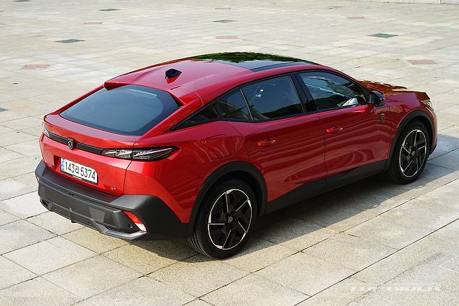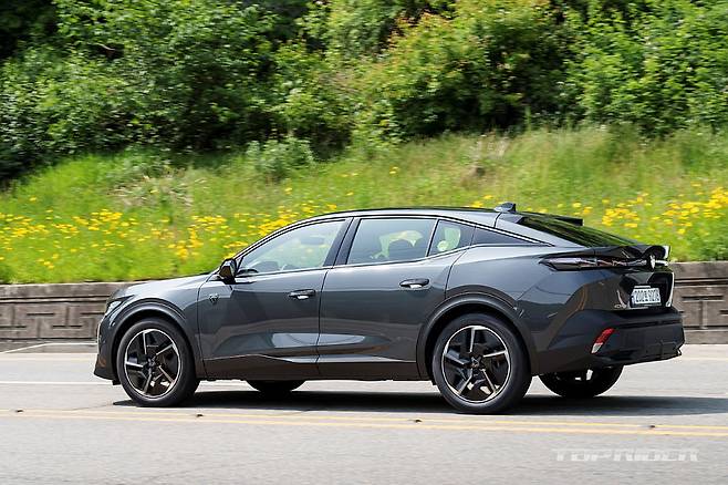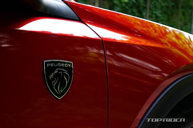 측면에서는 SUV 대비 낮은 전고와 SUV 수준의 최저지상고를 통해 크로스오버 특유의 역동적인 분위기를 연출한다. 완만하게 낮아지는 쿠페형 루프라인과 19인치 대구경 휠의 밸런스가 좋다. 특히 새롭게 적용되는 1열 도어의 방패형 푸조 엠블럼은 스포츠카 스타일이다.