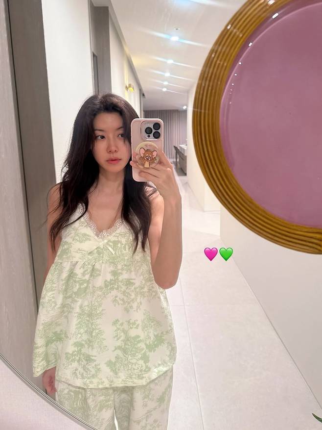 특히 실내 곳곳의 부드러운 조명, 자연스러운 배경, 그리고 셀카 속 두 개의 하트 이모티콘(핑크·연두)이 그녀만의 따뜻한 에너지를 더한다.
