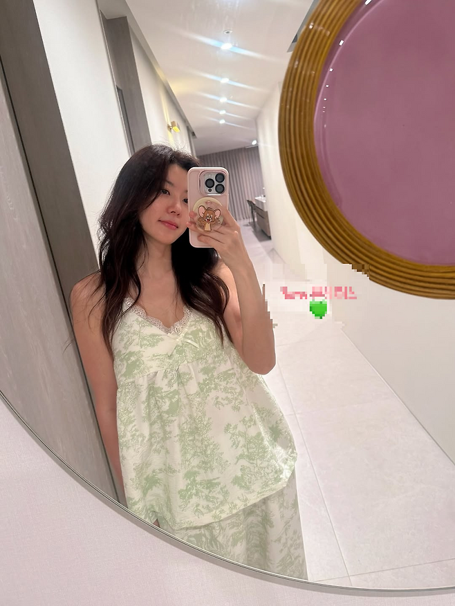 박한별은 연한 초록빛 나뭇잎 패턴의 크림색 슬립과 팬츠로 편안한 홈웨어룩을 선보였다.