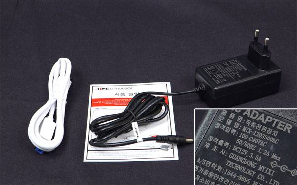 ipTIME UH1005QC 허브에는 전력 공급을 위한 DC 어댑터(12V - 3.5A)와 PC나 노트북 등의 호스트 장비 연결을 위한 USB 3.2 Gen2 케이블, 팜플렛형 사용 설명서가 제공된다.