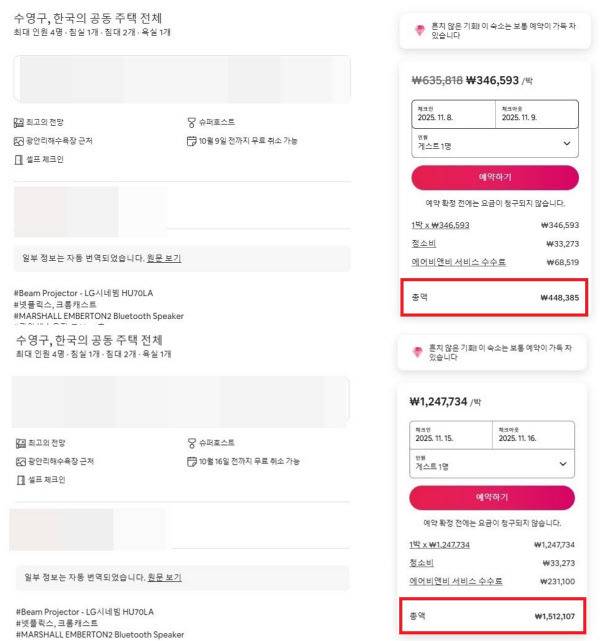 8일 기준 에어비앤비에 올라온 수영구 한 아파트 숙소는 축제 당일 1박 요금이 수수료 포함 151만원에 달한다. 불과 일주일 전만 해도 44만8000원이던 곳이다. 또 다른 숙소는 18만4000원에서 47만원으로 두 배 이상 올랐다. 단기간에 최대 4배 폭등이다. 치솟는 가격에 관광객들은 울며 겨자 먹기로 비싼 요금을 감수하거나 아예 예약을 포기하고 있다.