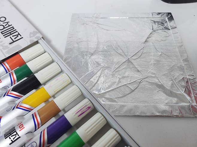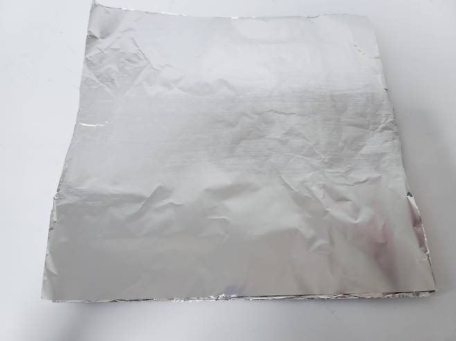 그다음 물티슈 또는 휴지를 이용해 은박지가 찢어지지 않도록 꾹꾹 누르며 비벼주세요. 물티슈가 좀 더 안전하게 눌러진답니다.