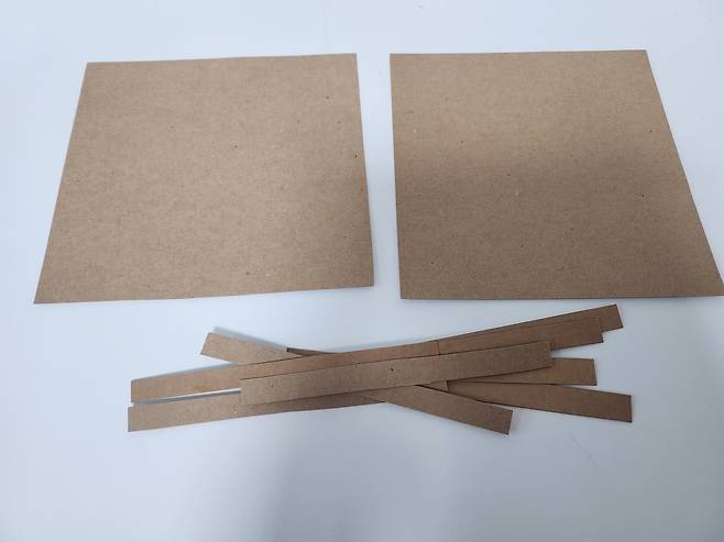 두꺼운 종이를 정사각형 모양으로 자르고 액자 테두리가 될 긴 종이를 잘라주세요. 넓이는 1~2cm 정도가 적당하답니다.
