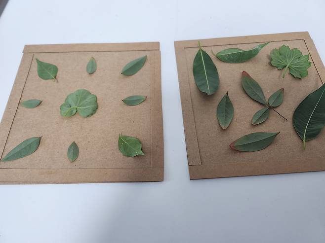 이번 자연물 만들기는 마른 낙엽이나 단풍이 아닌 싱싱한 나뭇잎이 필요해요!