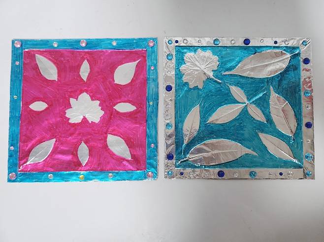준비물 : 나뭇잎, 두꺼운 종이, 은박지(쿠킹호일), 매직, 양면테이프, 가위