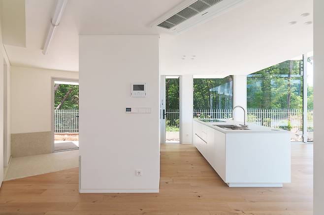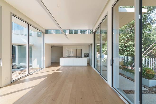 본 주택은 부지가 가진 자연 요소를 적극 활용해 완성됐다. 세 개로 나뉜 정원은 풍경을 담고 창과 캐노피를 통해 시간과 계절의 흐름을 느낄 수 있다. 덕분에 실내에서는 시원한 개방감과 아늑한 공간감을 동시에 느낄 수도 있다.