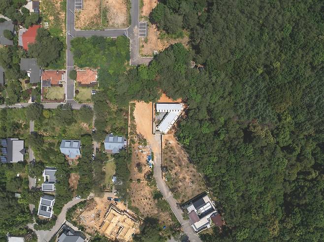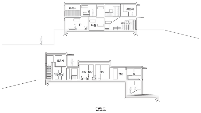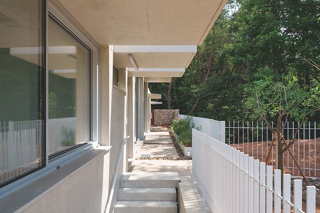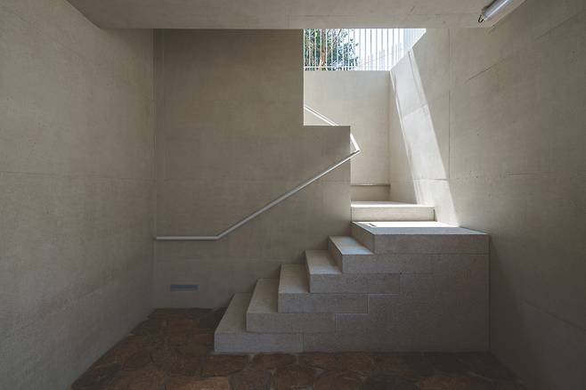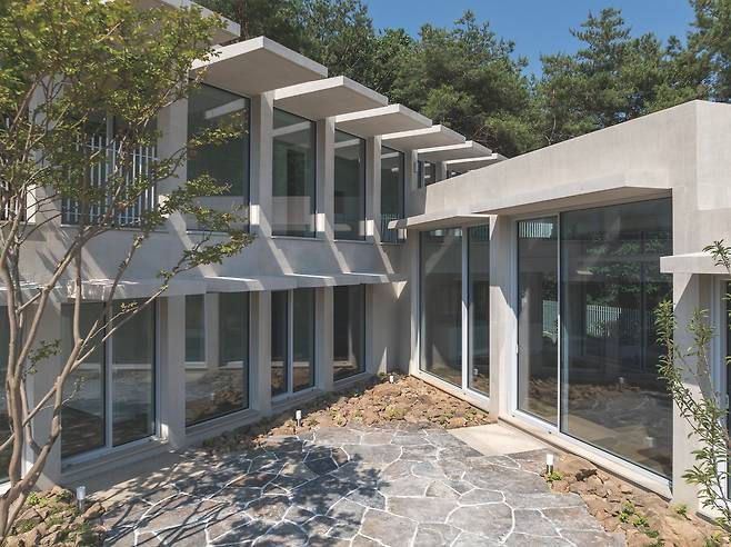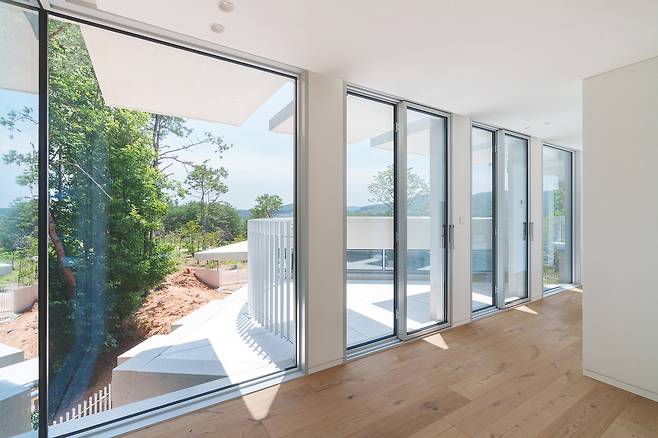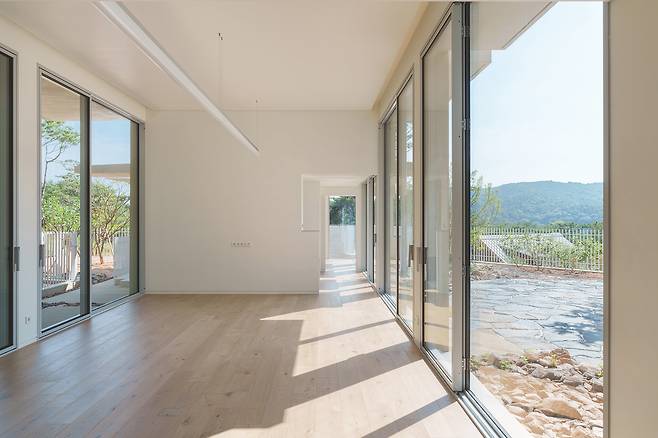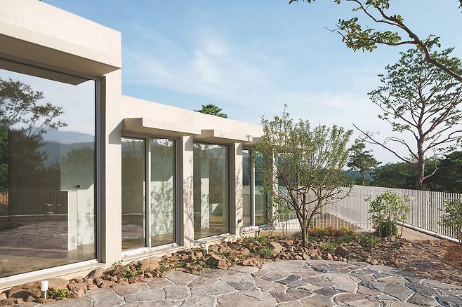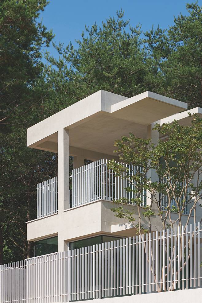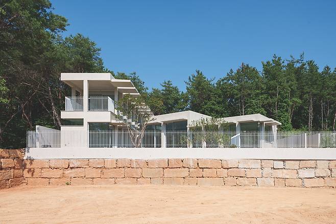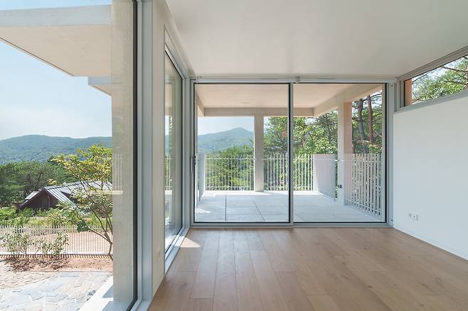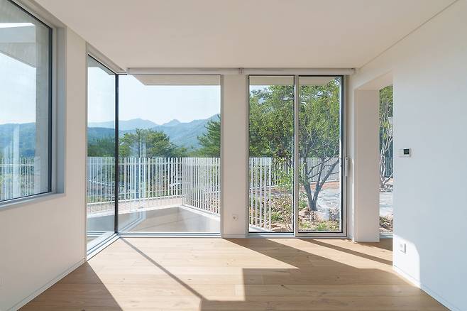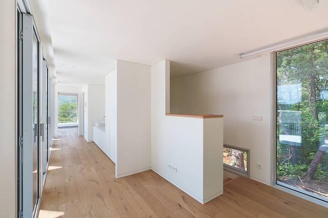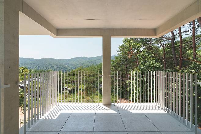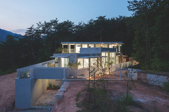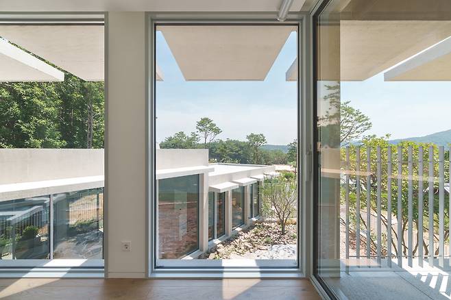 첫 번째 매스는 숲을 따라 단층으로 배치돼 높은 층고를 가진 공간을 통해 숲과의 수평적 관계를 강조한다. 두 번째 매스는 산과 숲을 연결하는 방향으로 길게 펼쳐지며 2층 규모로 자연스럽게 남향을 향해 배치됐다. 2층에 올라서면 한쪽에는 가까운 숲이, 다른 쪽에는 멀리 보이는 산세가 시야에 들어온다.