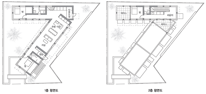집 안으로 들어서면 두 매스가 감싸 안은 삼각형 형태의 중정이 나타난다. 이 중정은 집 내부와 외부 그리고 두 매스를 연결하는 중요한 공간이다.
