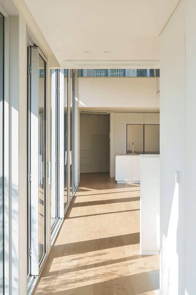 풍경에 정원이 대응한다면 채광은 창과 캐노피가 담당한다. 창은 빛을 들이고 캐노피는 빛을 막는다. 얼핏 모순 같은 이 두 요소의 협력이 공간의 드라마를 결정짓는다. 북쪽을 제외한 모든 창에는 캐노피가 설치됐다. 1.8m 간격으로 놓인 창들은 질서 정연하게 배치돼 자연광을 일정하게 실내로 유입한다. 거실에는 더 크고 높은 창을 두어 집의 중심 공간에 풍부한 채광과 함께 시원한 개방감을 더하도록 했다.