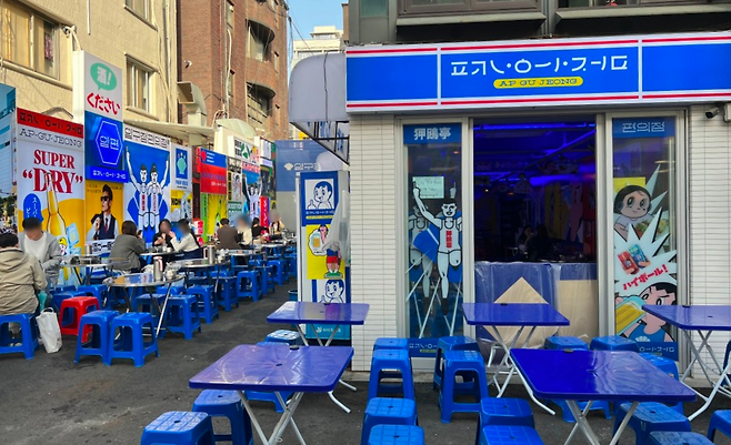 지금 가는 '압구정 편의점'도 제가 직접 런칭한 브랜드예요. 처음 시작할 때만 해도 일본 여행이 자유롭지 않았어요. 비자가 있어야만 갈 수 있었고... 근데 저는 어릴 때부터 일본 여행을 너무 좋아했기 때문에 일본 아직 안 가본 친구들도 일본에 온 느낌을 주고 싶어서 기획을 하게 됐던 매장이에요. 여기는 지금 일본에 있는 편의점처럼 만들어 놨는데, 안은 술집인 거예요.