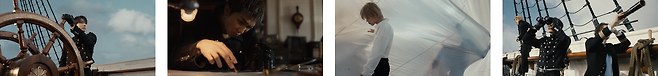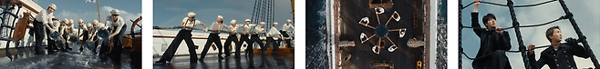 하지만 비록 그녀의 눈에는 보이지 않지만, 뒤에서 항상 이를 지켜보며 묵묵히 곁을 지키는 존재들이 있는데요. 바로 방탄소년단의 일곱 멤버입니다. 멤버들은 그녀가 탄 배가 안전하게 나아가도록 신중히 방향키를 조종하고, 외부와의 교신을 시도하기도 하죠. 이뿐만 아니라 힘을 합쳐 갑판도 깨끗하게 정리하고, 일사불란하게 움직이며 배의 캡스턴(capstan)을 돌리기도 합니다. 특히 여럿이 같은 속도로 많은 힘을 모아야 하는 캡스턴 장치를 활용한 이 장면은, 멤버들의 끈끈한 팀워크와 서로의 호흡을 맞춰 나아가고자 하는 자세를 상징하는 것 같네요!💪